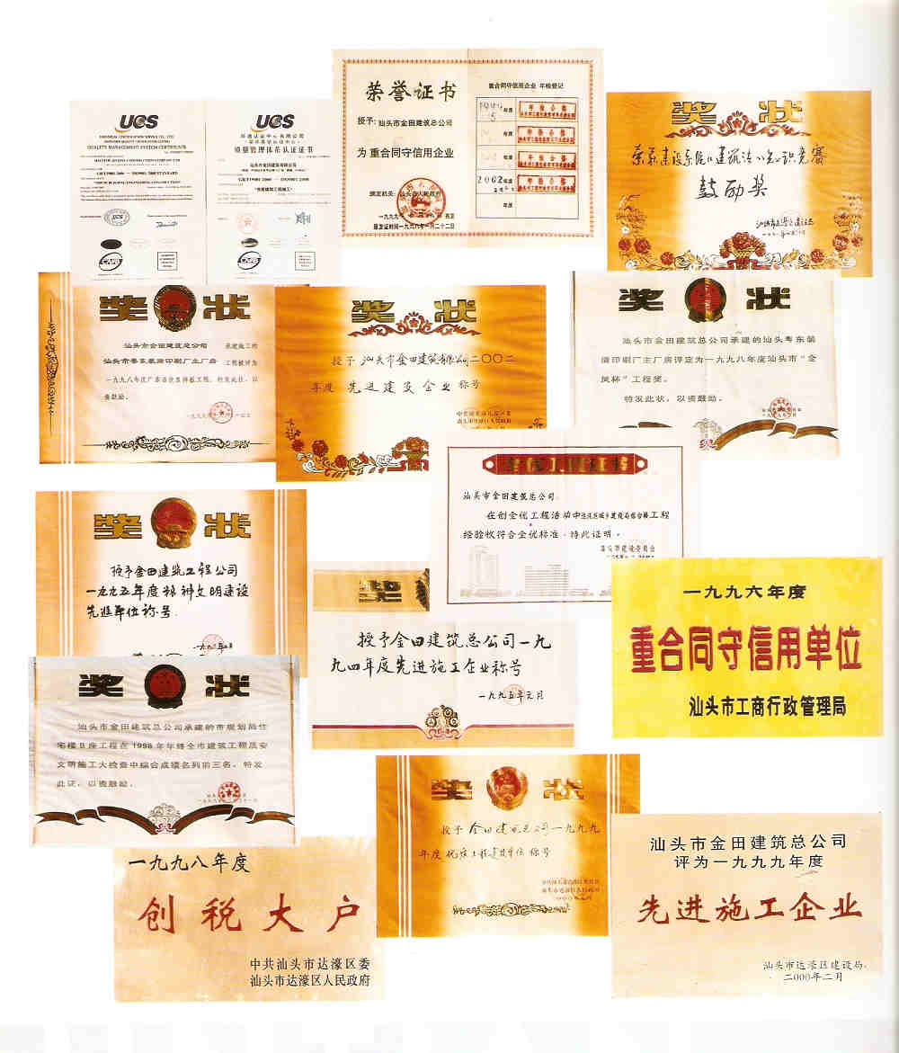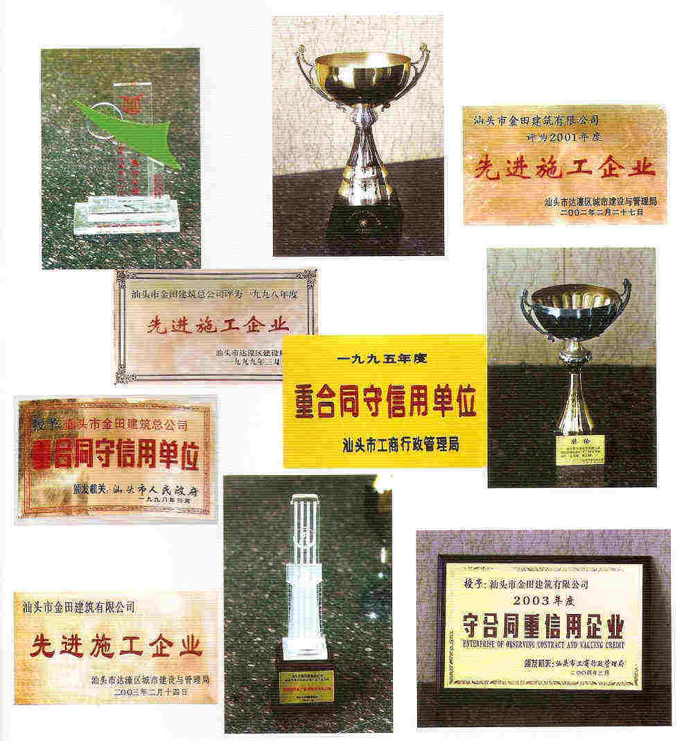 公司成立以來,承擔(dān)大批工程施工項目的建設(shè),堅持“質(zhì)量第一、信譽第一、信守合同、熱誠服務(wù)”的經(jīng)營宗旨,和“視質(zhì)量為生命、以精品爭市場”的經(jīng)營策略,在工程施工和管理方面狠下苦功,工程項目優(yōu)良率逐年提高,工程優(yōu)良率達(dá)到80%以上,合格率100%,取得喜人的成績。承建的汕頭市粵東裝璜印刷廠主廠房被評為廣東省優(yōu)良樣板工程,承建的汕頭市第三人民醫(yī)院門診綜合樓、達(dá)濠區(qū)建設(shè)局綜合樓、汕頭市紫云莊商品樓被評為全優(yōu)工程;公司在安全文明施工方面也屢受嘉獎,一九九八年年終全市建筑工程質(zhì)安文明施工大檢查中綜合成績名列前三名。在追求經(jīng)濟效益的同時,公司十分注重社會效益,自一九九五年以來,連續(xù)被汕頭市工商局、廣東省工商局授予“重合同、守信用”單位的光榮稱號,一九九七年被建設(shè)銀行汕頭分行評審為AA級信用等級單位,并多次被達(dá)濠區(qū)政府、區(qū)建設(shè)局授予先進(jìn)施工企業(yè)和納稅大戶的光榮稱號。