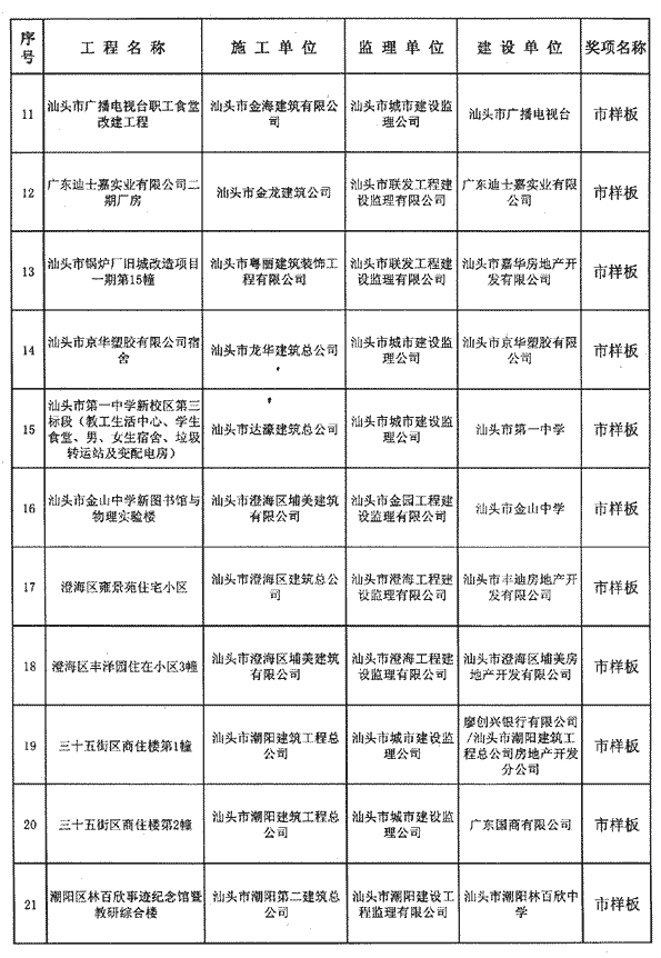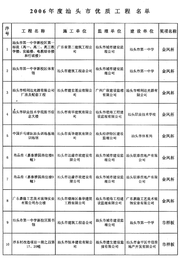 2006年度汕頭市優(yōu)質(zhì)工程評(píng)選結(jié)果公示汕府建公示[2007]2號(hào)