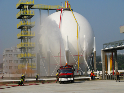 演練總指揮徐凱發(fā)出指令后,演練正式開始。得源公司塔頭氣庫(kù)正進(jìn)行裝槽車作業(yè)時(shí),供應(yīng)儲(chǔ)罐1號(hào)球罐出液管中間連接軟管發(fā)生“破裂”,造成石油氣“泄漏”,報(bào)警系統(tǒng)啟動(dòng),操作人員停止作業(yè),啟動(dòng)緊急切斷系統(tǒng)及消防噴淋系統(tǒng),由于1號(hào)球罐的切斷閥門故障,漏出的氣體繼續(xù)蔓延,兩名庫(kù)區(qū)操作人員試圖進(jìn)行緊急堵漏搶修,由于區(qū)域液化石油氣氣體濃度較高,一名搶修人員在1號(hào)球罐罐區(qū)外窒息暈倒。因現(xiàn)場(chǎng)石油氣泄漏擴(kuò)散面積大,該司全面啟動(dòng)應(yīng)急預(yù)案并立即報(bào)警同時(shí)向區(qū)、市住建局報(bào)告并請(qǐng)求增援。在市區(qū)兩級(jí)住建、消防、衛(wèi)生等部門通力合作下,搶險(xiǎn)人員將險(xiǎn)情消除。歷時(shí)30分鐘的演練過程嚴(yán)格按《汕頭市燃?xì)庑袠I(yè)安全生產(chǎn)事故應(yīng)急救援演練方案》實(shí)施。