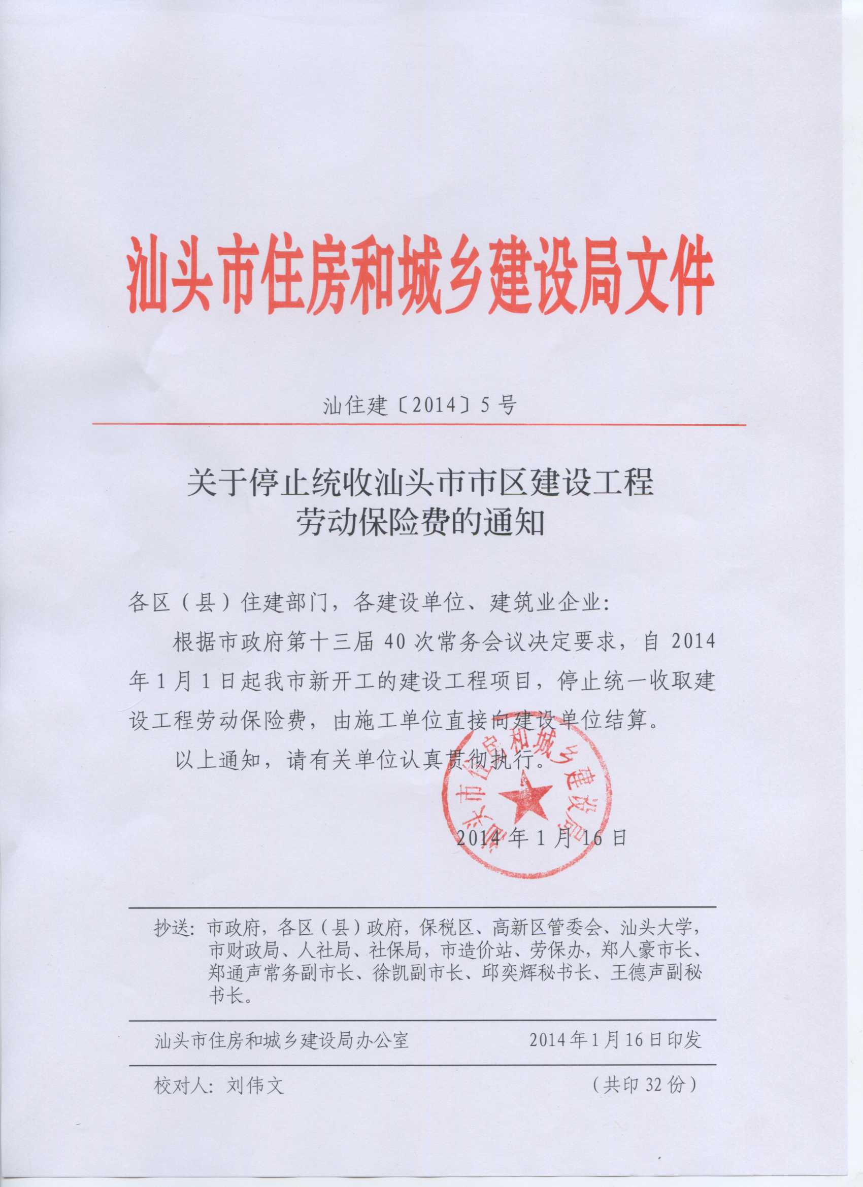 關(guān)于停止統(tǒng)收汕頭市市區(qū)建設(shè)工程勞動保險費(fèi)的通知(汕住建【2014】5號)