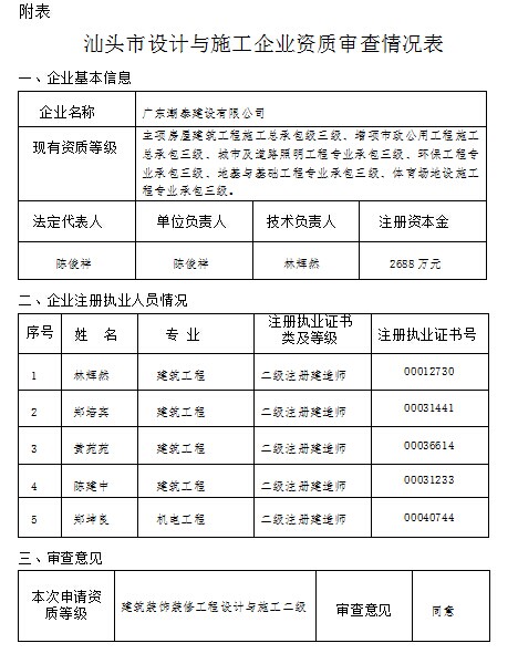 關(guān)于設(shè)計與施工資質(zhì)審查意見的公示汕住建公示〔2014〕31號