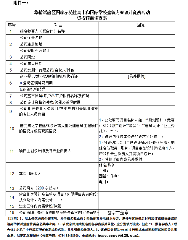 1、《資格預審調查表》(正本,簽字并加蓋公章)(可到華僑試驗區(qū)官方網(wǎng)站(http://www.swa.gov.cn或廣東省機電設備招標有限公司網(wǎng)站(http://www.chinaguangdongbidding.com下載)。
