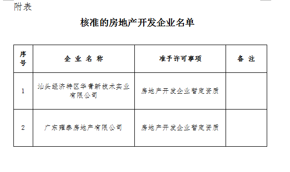 根據(jù)《中華人民共和國行政許可法》、《中華人民共和國城市房地產(chǎn)管理法》和有關(guān)房地產(chǎn)開發(fā)企業(yè)資質(zhì)管理規(guī)定,現(xiàn)將經(jīng)我局審查核準的房地產(chǎn)開發(fā)企業(yè)名單予以公布(見附表)。