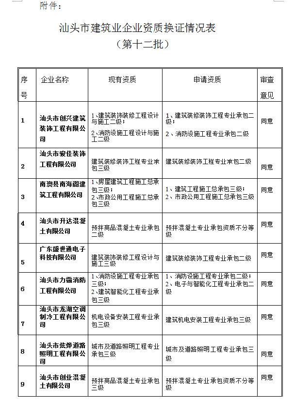 關(guān)于建筑業(yè)企業(yè)資質(zhì)換證審查意見(jiàn)的公示(第十二批)汕住建公示 [2016]40號(hào)