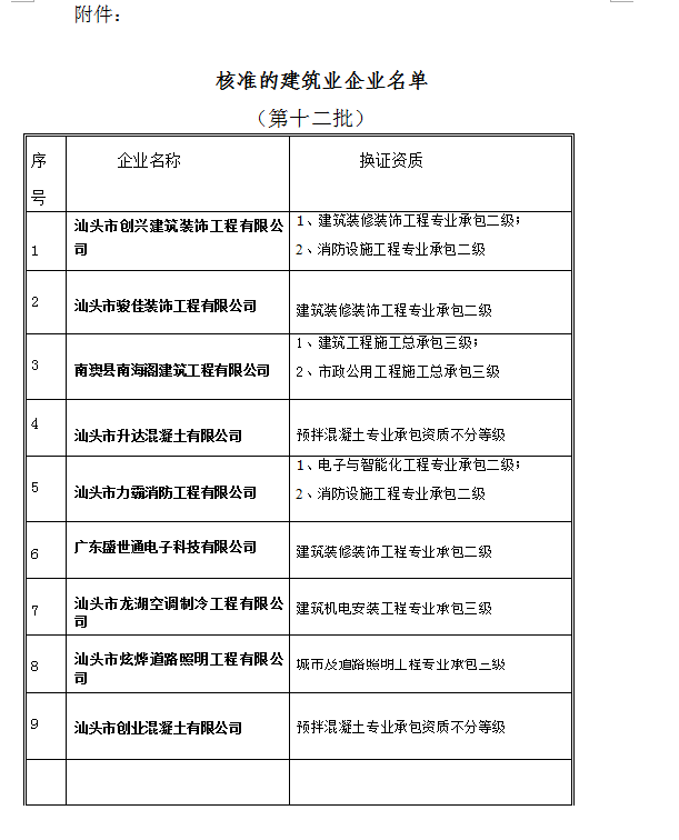 瀏覽次數(shù):2487按照《廣東省住房和城鄉(xiāng)建設(shè)廳關(guān)于開(kāi)展我省建筑業(yè)企業(yè)資質(zhì)簡(jiǎn)單換證工作的通知》(粵建許函[2015]2331號(hào))的規(guī)定,現(xiàn)將經(jīng)我局核準(zhǔn)換證的汕頭市創(chuàng)興建筑裝飾工程有限公司等9家企業(yè)名單予以公布(見(jiàn)附件)。