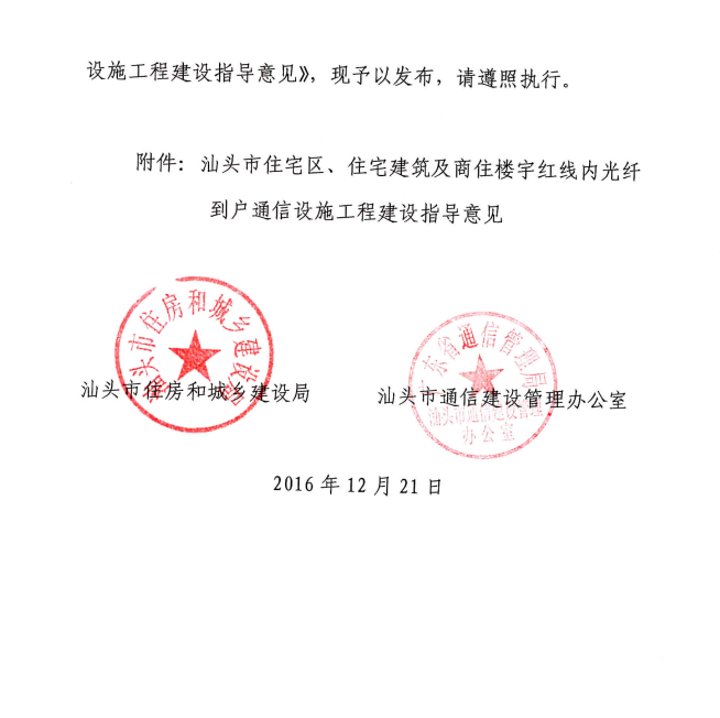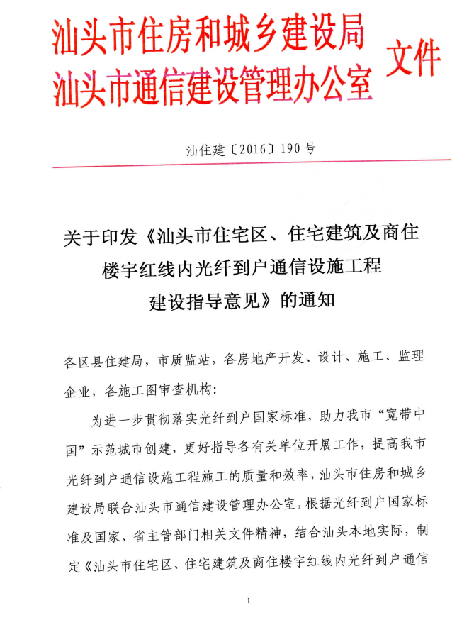 關(guān)于印發(fā)《汕頭市住宅區(qū)、住宅建筑及商住樓宇紅線內(nèi)光纖到戶通信設(shè)施工程建設(shè)指導(dǎo)意見(jiàn)》的通知汕住建[2016]190號(hào)