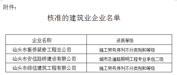 根據(jù)《中華人民共和國行政許可法》、《中華人民共和國建筑法》和有關(guān)建設(shè)工程企業(yè)資質(zhì)管理規(guī)定,現(xiàn)將經(jīng)我局審查核準(zhǔn)的建筑業(yè)企業(yè)名單予以公布(見附件)。 特此公告。
