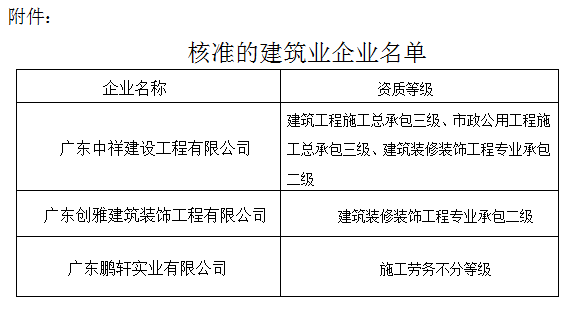 根據(jù)《中華人民共和國行政許可法》、《中華人民共和國建筑法》和有關(guān)建設(shè)工程企業(yè)資質(zhì)管理規(guī)定,現(xiàn)將經(jīng)我局審查核準的廣東中祥建筑工程有限公司等三家建筑業(yè)企業(yè)名單予以公布(見附件)。 特此公告。