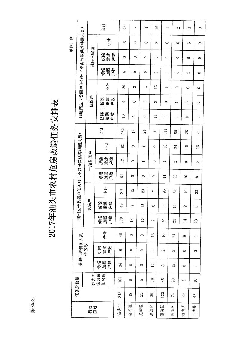 關(guān)于下達2017年汕頭市農(nóng)村危房改造任務(wù)及明確補助標準的通知汕住建通【2017】200號