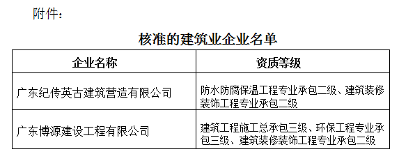根據(jù)《中華人民共和國行政許可法》、《中華人民共和國建筑法》和有關(guān)建設(shè)工程企業(yè)資質(zhì)管理規(guī)定,現(xiàn)將經(jīng)我局審查核準(zhǔn)的建筑業(yè)企業(yè)名單予以公布(見附件)。