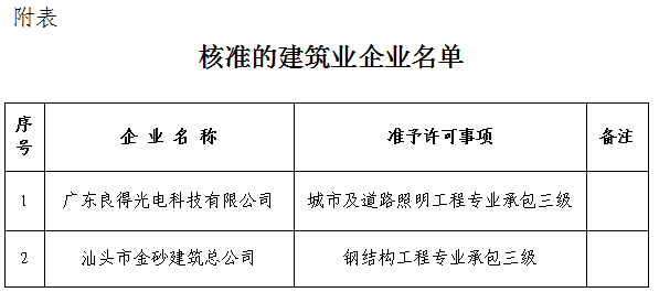 根據(jù)《中華人民共和國行政許可法》、《中華人民共和國建筑法》和有關建設工程企業(yè)資質(zhì)管理規(guī)定,現(xiàn)將經(jīng)我局審查核準的廣東良得光電科技有限公司等2家建筑業(yè)企業(yè)名單予以公布(見附表)。