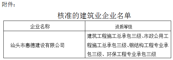 根據(jù)《中華人民共和國行政許可法》、《中華人民共和國建筑法》和有關(guān)建設(shè)工程企業(yè)資質(zhì)管理規(guī)定,現(xiàn)將經(jīng)我局審查核準(zhǔn)的建筑業(yè)企業(yè)名單予以公布(見附件)。