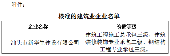 關(guān)于建筑業(yè)企業(yè)資質(zhì)核準(zhǔn)結(jié)果的公告汕住建公告〔2018〕31號(hào)