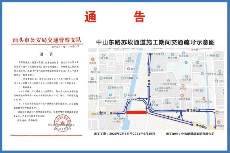 近日,市公安交警支隊發(fā)布公告,因汕頭海灣隧道北岸施工需要,中山東路(天山南路口至中山東路橋西側)路段從2020年2月5日起到2021年6月30日實施封閉施工,過往車輛需要繞行中山東路北側臨時修建的導改路。受疫情防控影響,施工單位中鐵隧道局汕頭海灣隧道北岸工區(qū)將這一封閉繞行措施推遲到明天(2月13日)凌晨零點起實行。