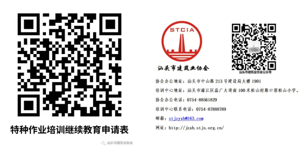 報(bào)名及培訓(xùn)地點(diǎn): 汕頭市濠江區(qū)礐石街道磊廣大道松山村路口汕頭市建筑業(yè)協(xié)會(huì)特種作業(yè)培訓(xùn)中心一樓報(bào)名處;聯(lián)系電話:0754—87888789;聯(lián)系人:王老師、陳老師