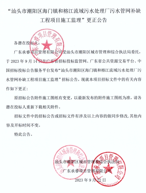 汕頭市潮陽區(qū)海門鎮(zhèn)和榕江流域污水處理廠污水管網補缺工程項目施工監(jiān)理