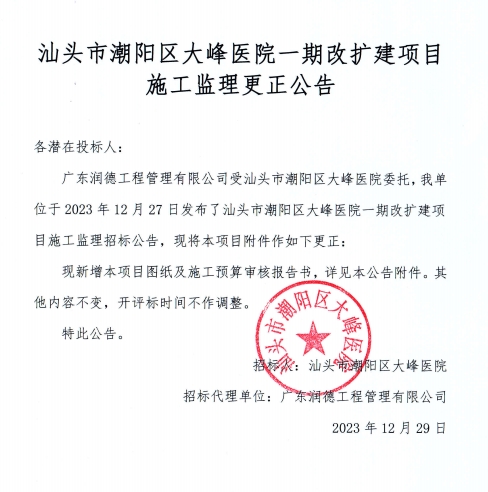 汕頭市潮陽區(qū)大峰醫(yī)院一期改擴建項目施工監(jiān)理