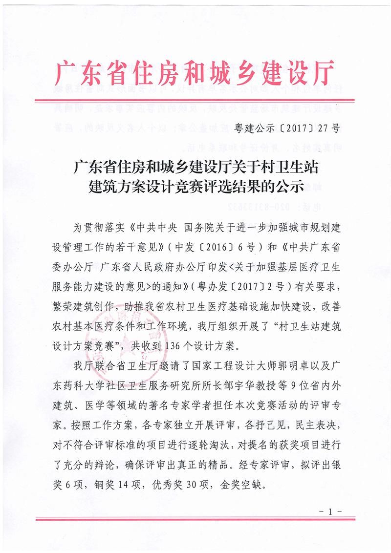 廣東省住房和城鄉(xiāng)建設(shè)廳關(guān)于村衛(wèi)生站建筑方案設(shè)計競賽評選結(jié)果的公示