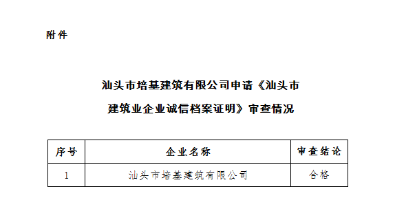關(guān)于公布汕頭市培基建筑有限公司申請汕頭市建筑業(yè)企業(yè)誠信檔案證明審查情況的通知