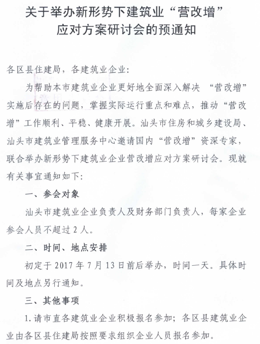 關(guān)于舉辦新形勢下建筑業(yè)“營改增”應(yīng)對方案研討會的預(yù)通知